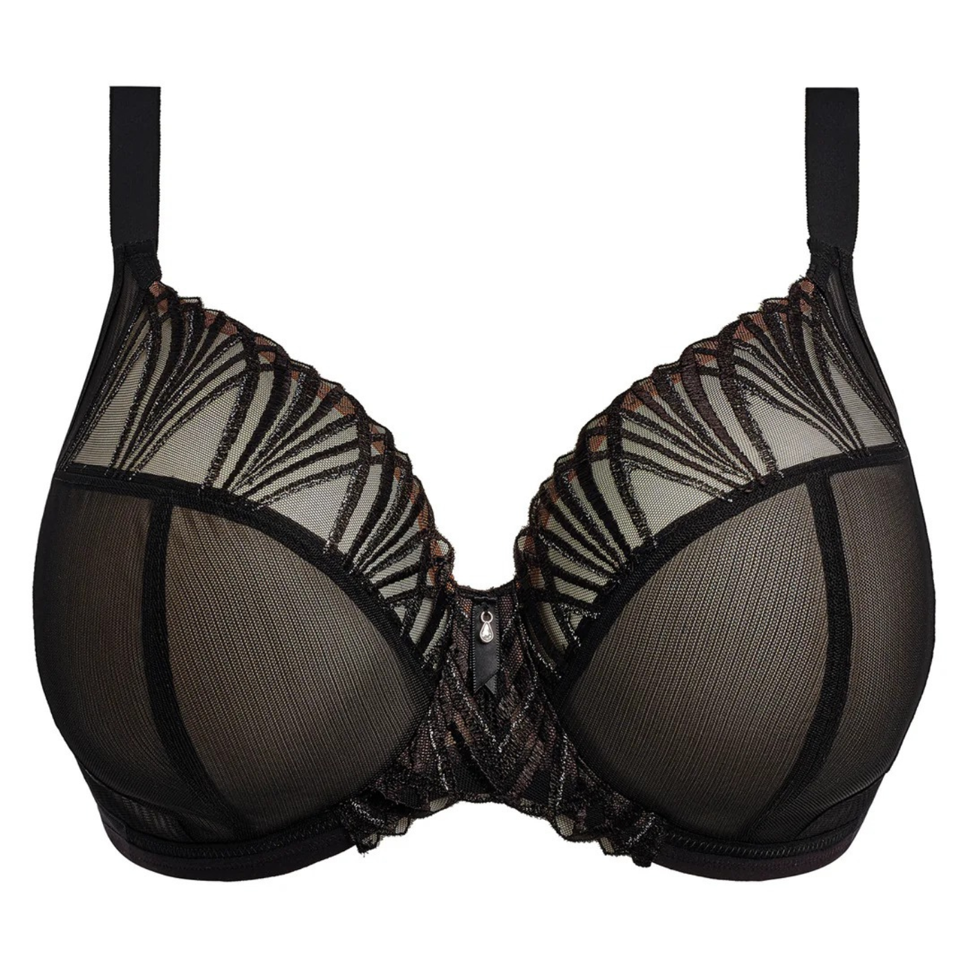 • Geoghegans Notes: Add to your lingerie collection with the Elomi Reja Black Underwired Plunge Bra, designed to make a statement. Showcasing striking fan-inspired embroidery and sheer panels, it offers a modern, elegant look that works for both everyday wear and special occasions. The plunge neckline is perfect for low-cut styles, while the supportive fit ensures all-day comfort and a beautifully flattering silhouette.