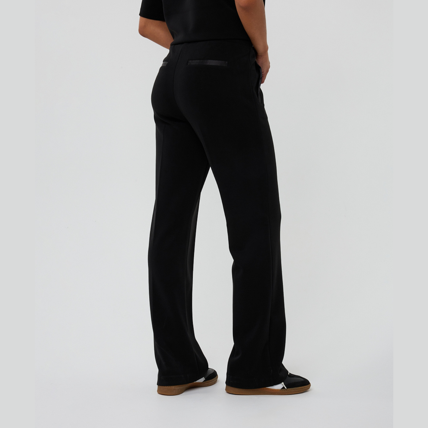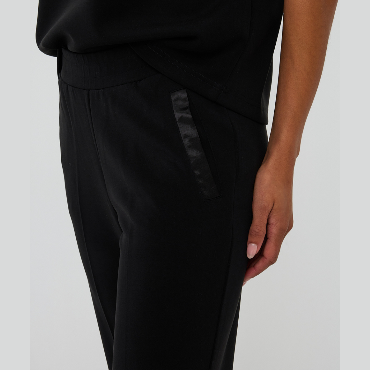 - Geoghegan's Notes: These soft modal trousers are designed for effortless comfort and pair beautifully with the matching tops and sweaters from the collection. Featuring an elastic waistband for a relaxed fit, they’re finished with subtle satin-look details on the front slit pockets and back piped pockets for a touch of elegance.