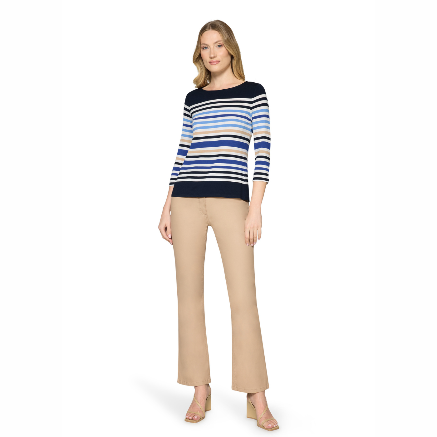 Full view shot of model wearing Betty Barclay 3/4 sleeve Stripy Top, with a white background.