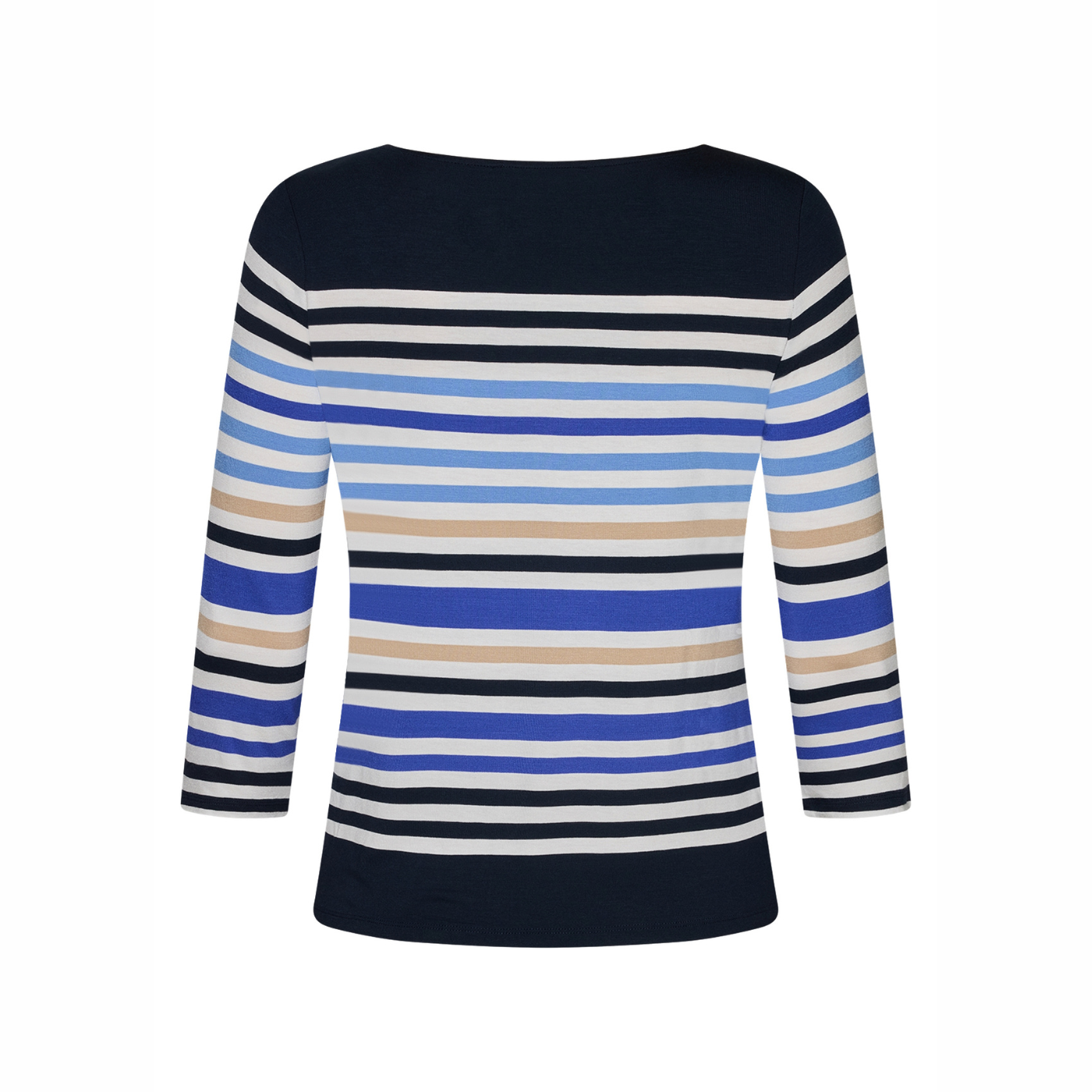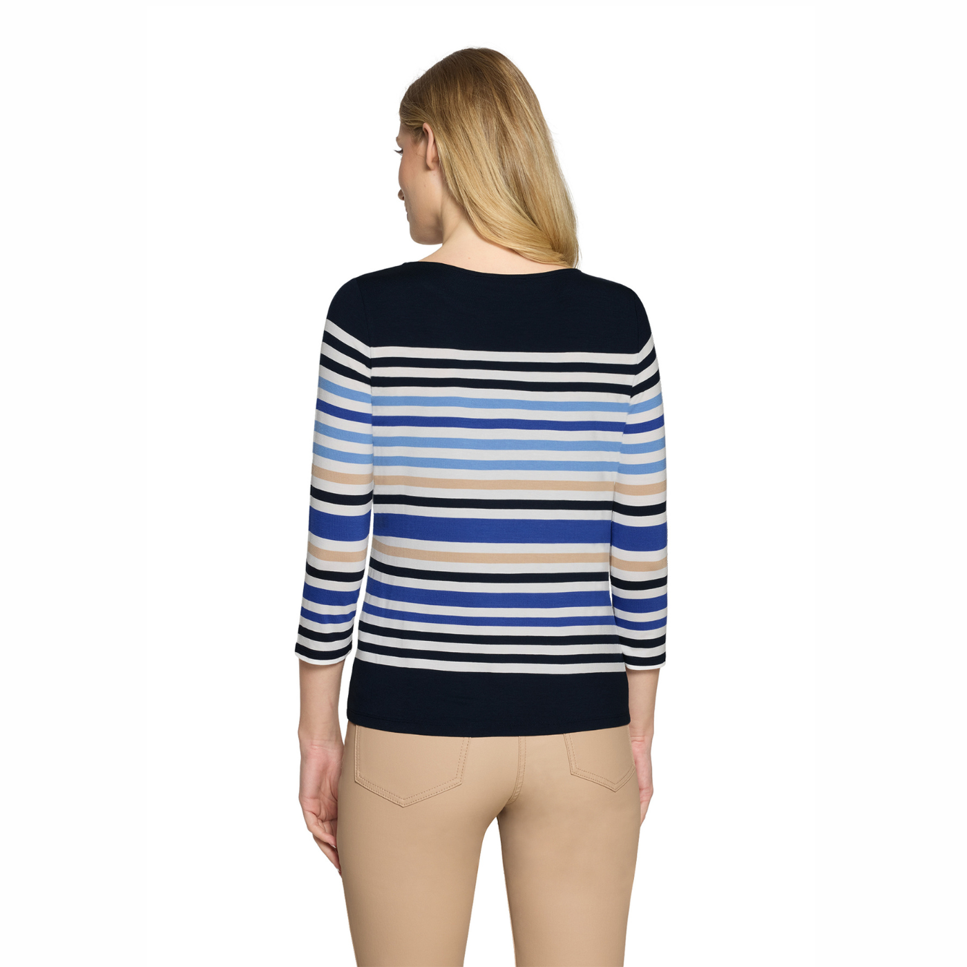 Back view shot of model wearing Betty Barclay 3/4 sleeve Stripy Top, with a white background.