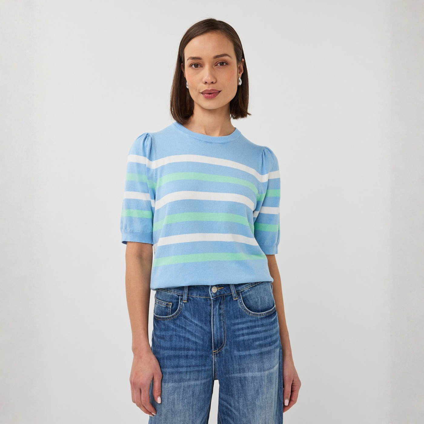 - Geoghegan's Notes: Soft and stylish, this puff-sleeve striped knit in Pacific combines comfort with a playful, feminine touch. Perfect for pairing with jeans or skirts for a polished everyday look.