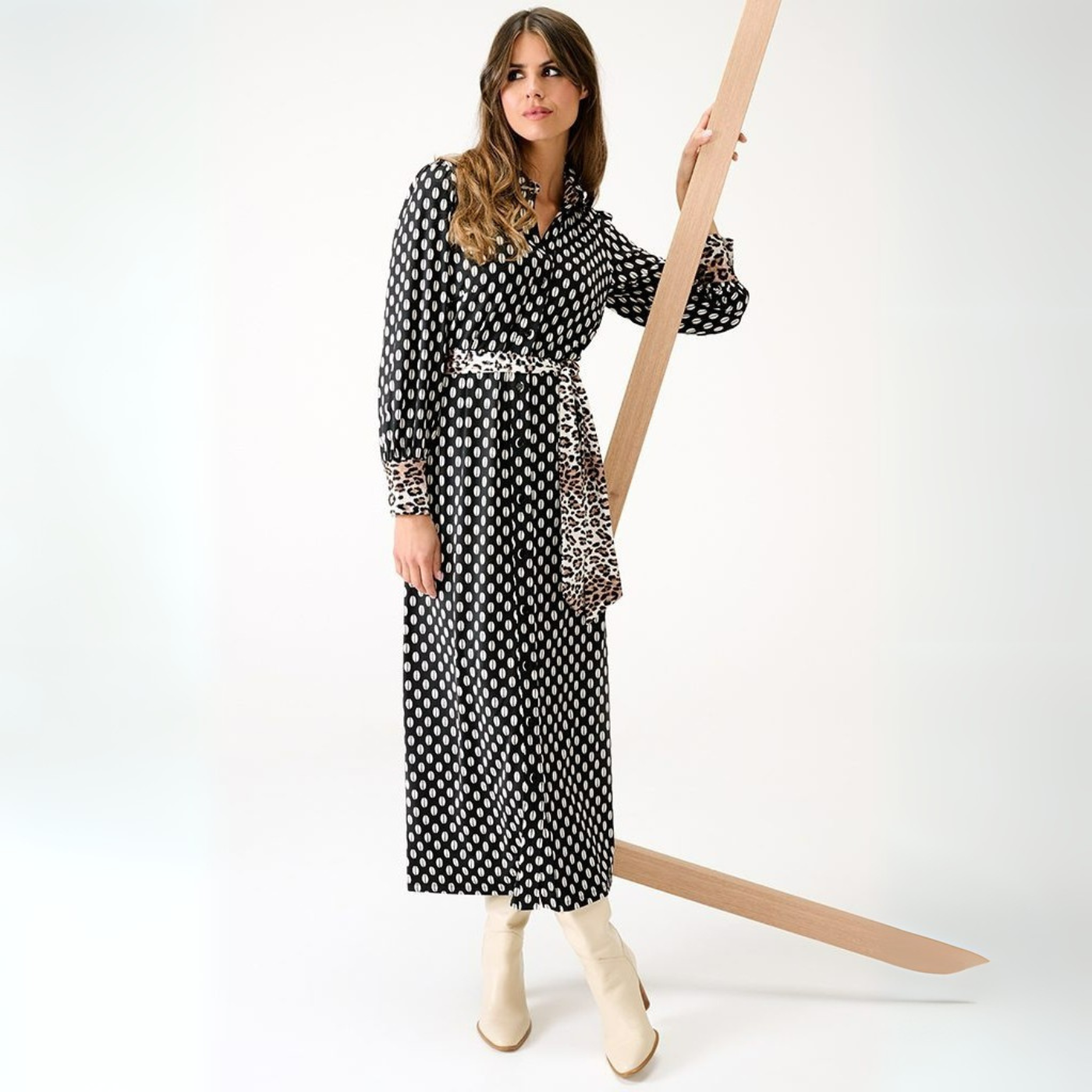 • Geoghegans Notes: Make a statement with the K Design Maxi Dress, featuring a unique coffee bean-inspired print that adds a modern twist to a classic silhouette. Teamed with this leopard print belt and designed with comfort and elegance in mind, this flowing maxi dress is perfect for both daytime outings and evening occasions, offering effortless style with every wear.