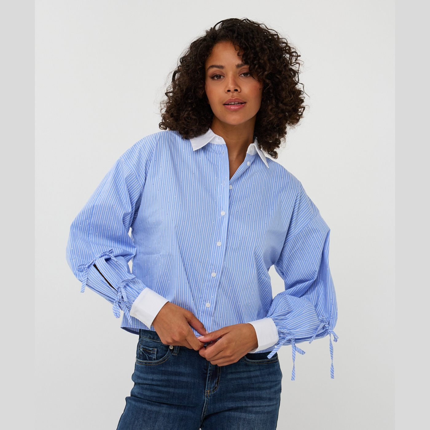 Woman wearing a light blue striped shirt with tied cuffs on a white background