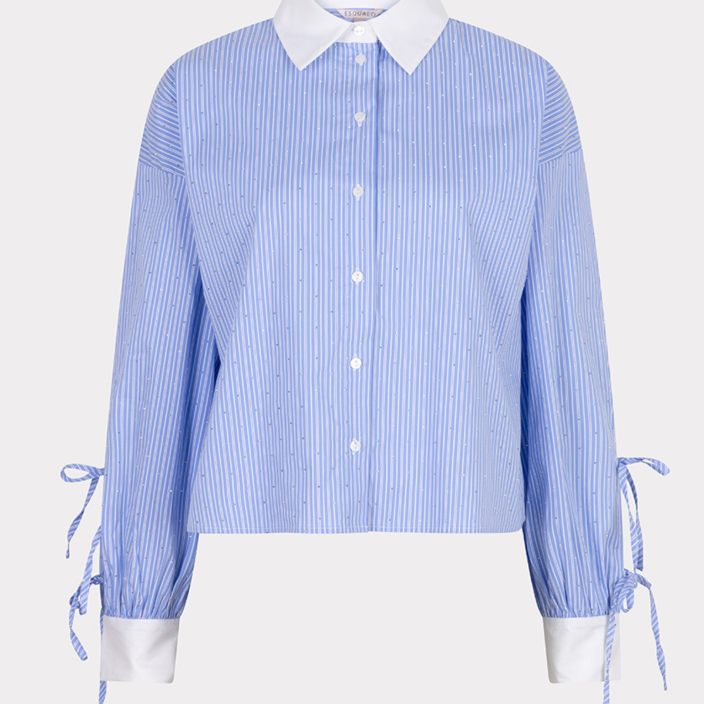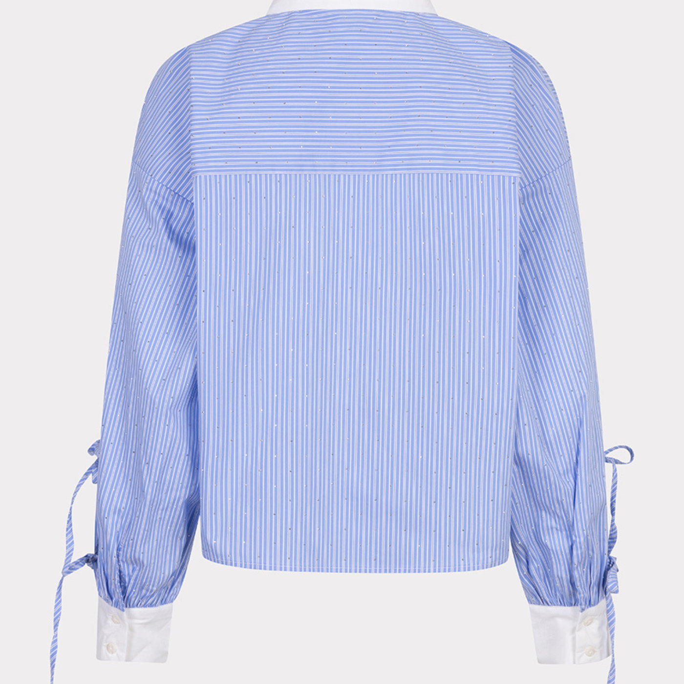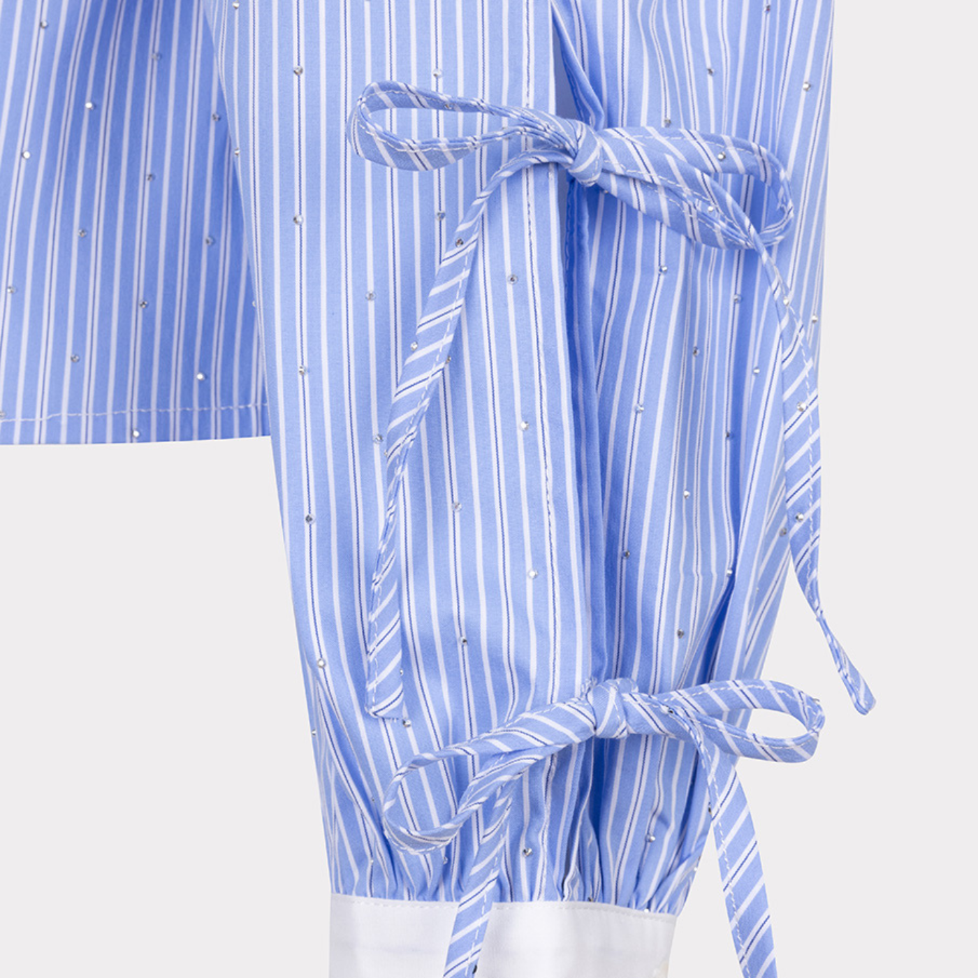• Geoghegan's Notes: Add a playful touch to your wardrobe with this cropped striped blouse, adorned with sparkling rhinestone details. Crafted from 100% cotton, it features charming bow accents on the sleeves, a crisp white lapel collar, and matching white cuffs for a fresh, stylish finish.