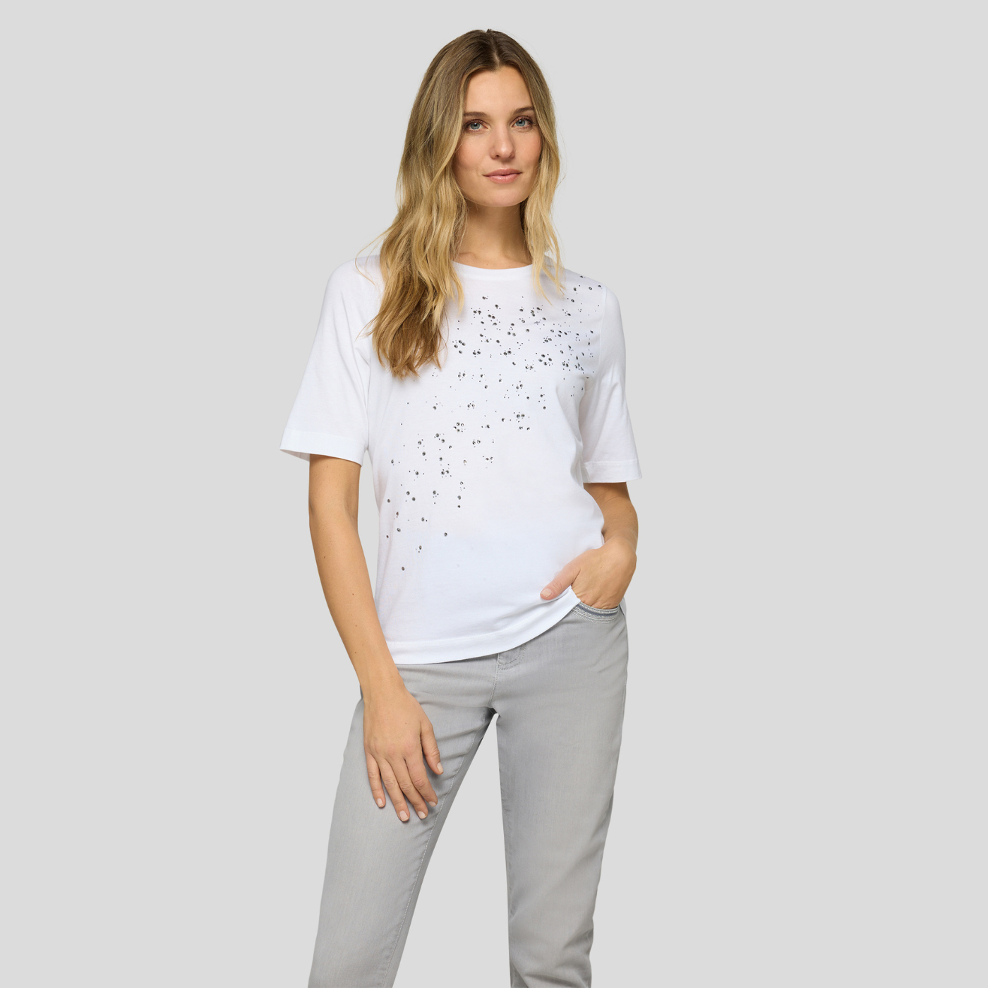 - Geoghegans Notes: The Rabe White Embellished T-Shirt brings effortless elegance to everyday dressing. Crafted in soft, breathable cotton and finished with subtle embellishment, it offers a refined take on a classic wardrobe staple. Perfect for pairing with jeans or tailored trousers, this versatile tee reflects the quality and style of Rabe for an understated yet polished look.