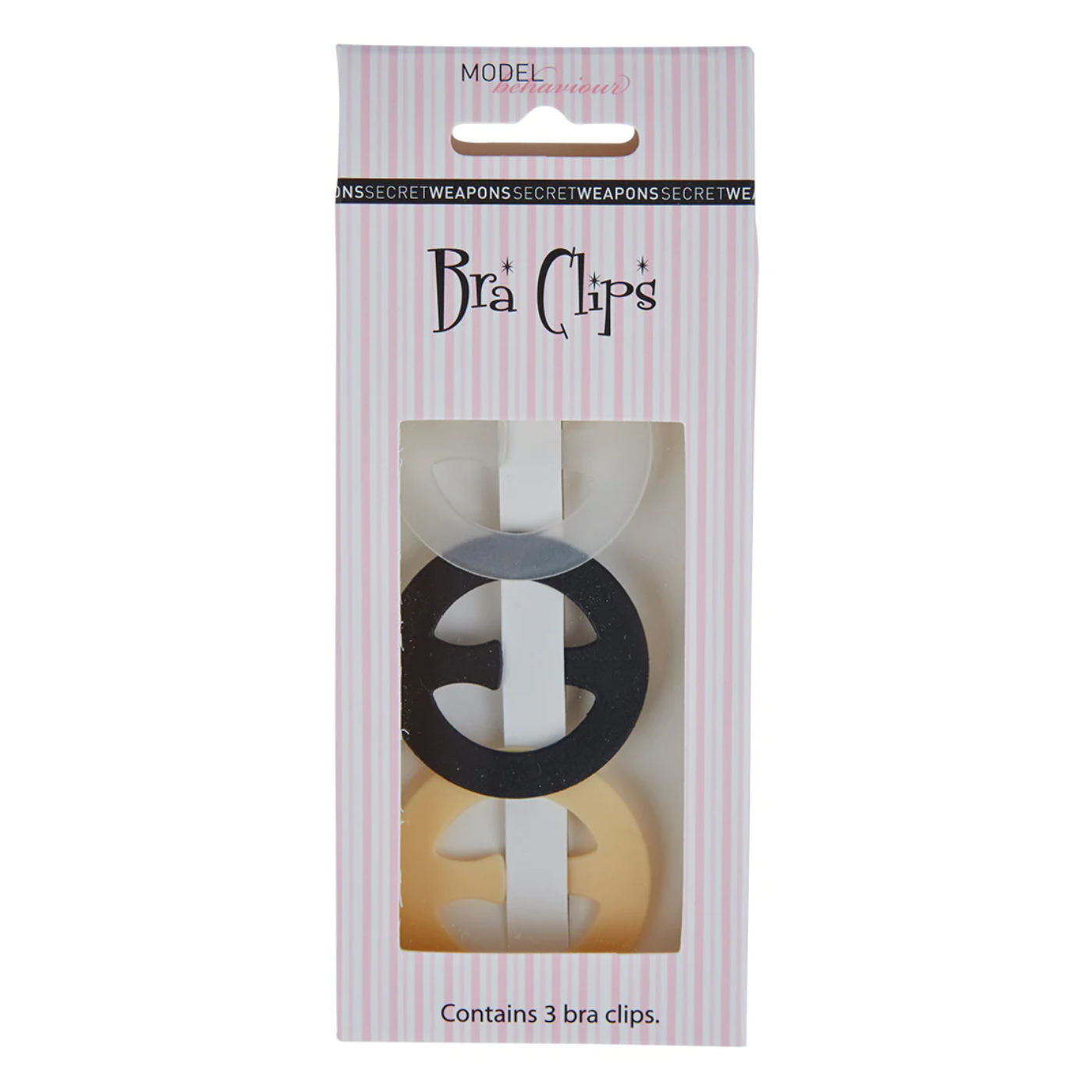- Geoghegans Notes: The Secret Weapons Racer Back Bra Clips are designed to convert your favourite bra to hide bra straps that you don't want to show. Simply slip the bra clip over your bra straps and pair with a racer back top or dress! Contains: Clear, Black & Nude. 43mm in diameter.