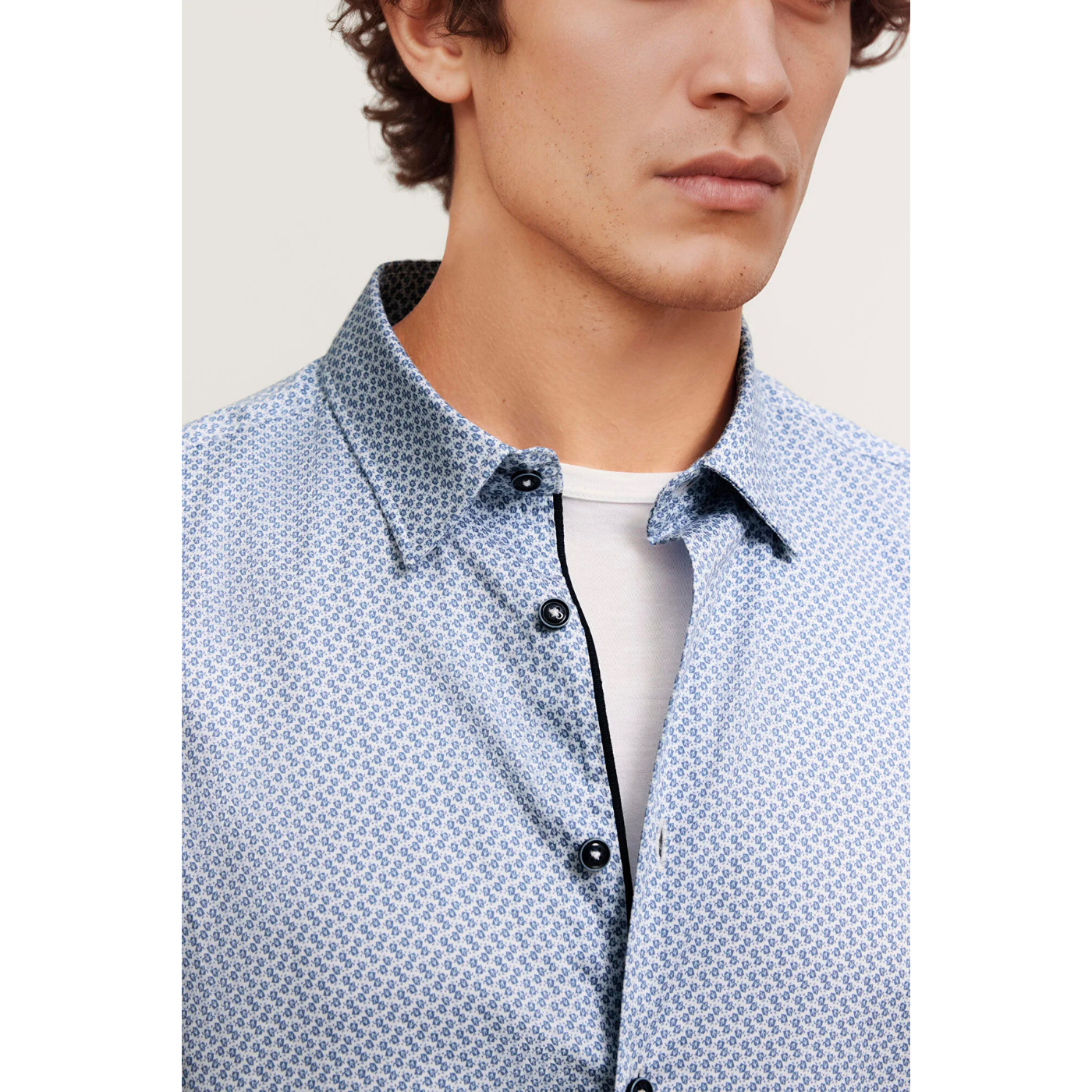 Light blue patterned shirt with black buttons on a white background