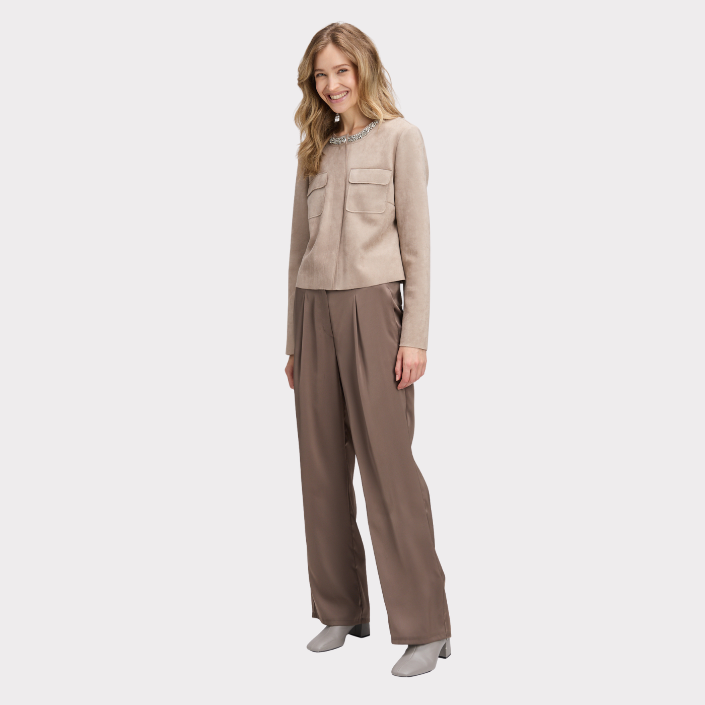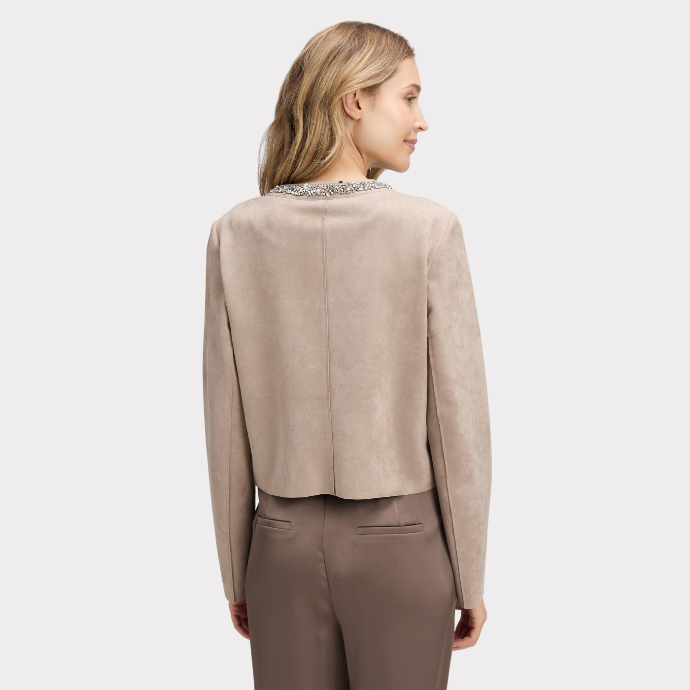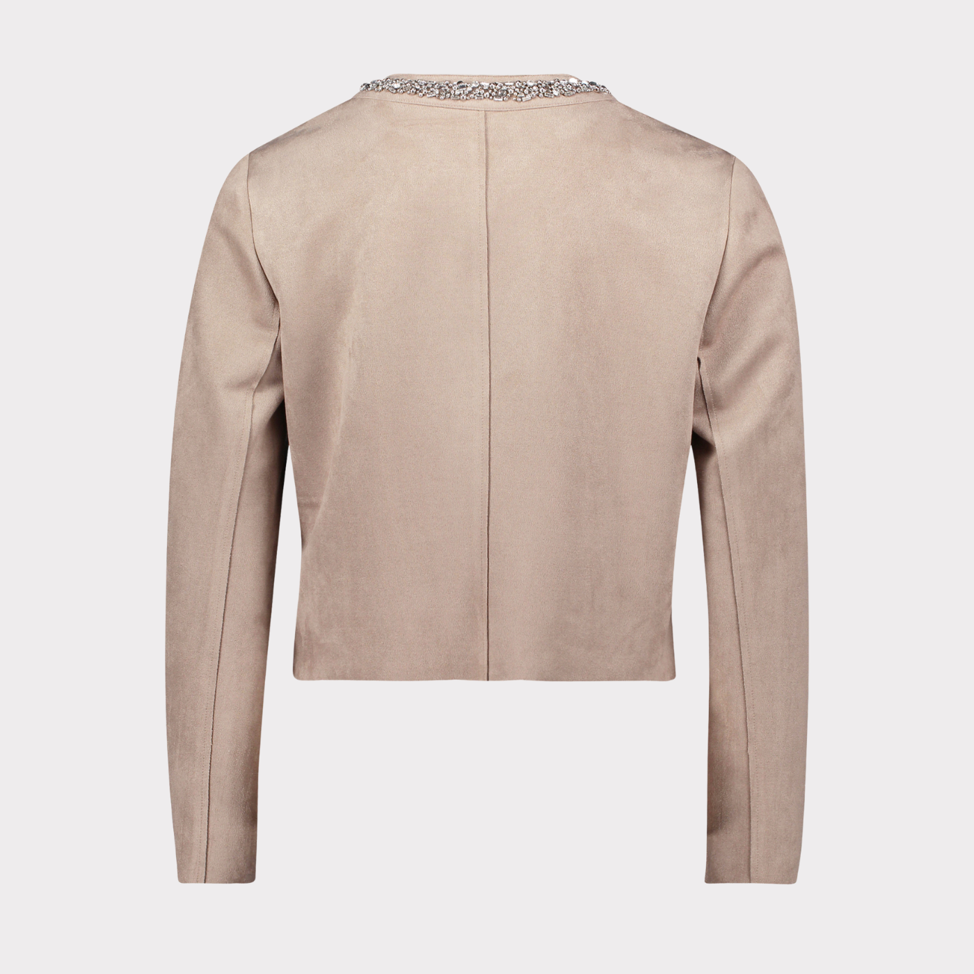 - Geoghegan's Notes: Add a touch of sophistication to your wardrobe with this stunning Betty Barclay jacket. Crafted in a soft, luxurious suede-like fabric, it features a tailored fit that flatters the silhouette while maintaining comfort. The jacket is designed with two chic chest pockets and a sleek, collarless neckline adorned with delicate, sparkling embellishments for a refined finish.