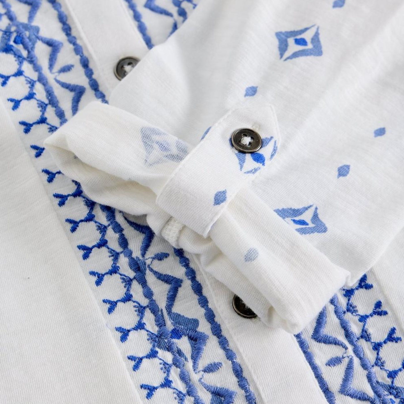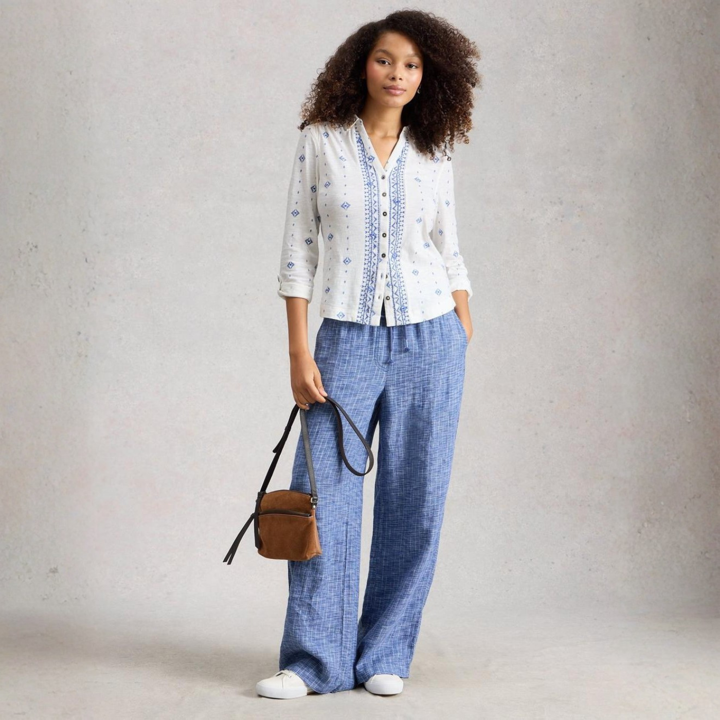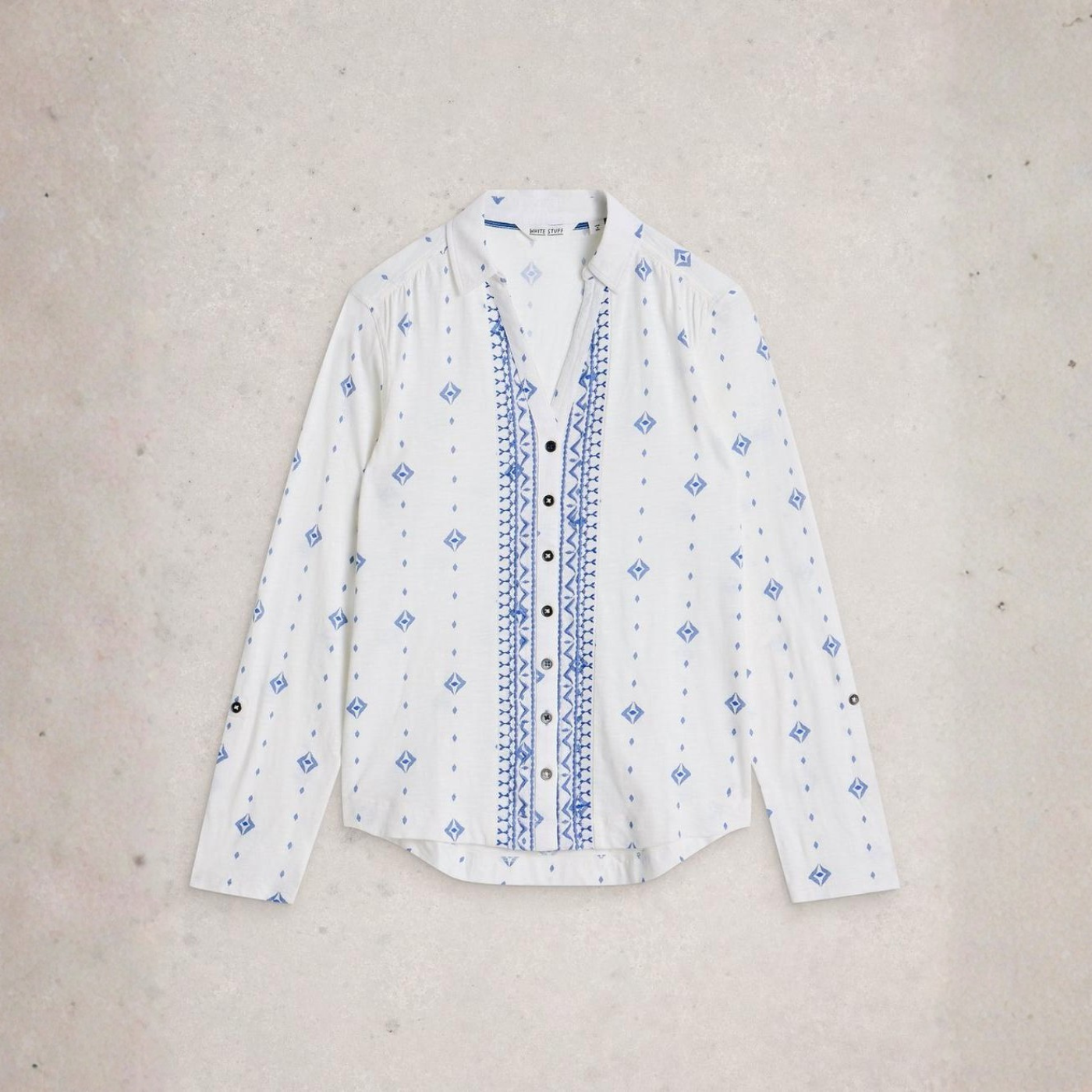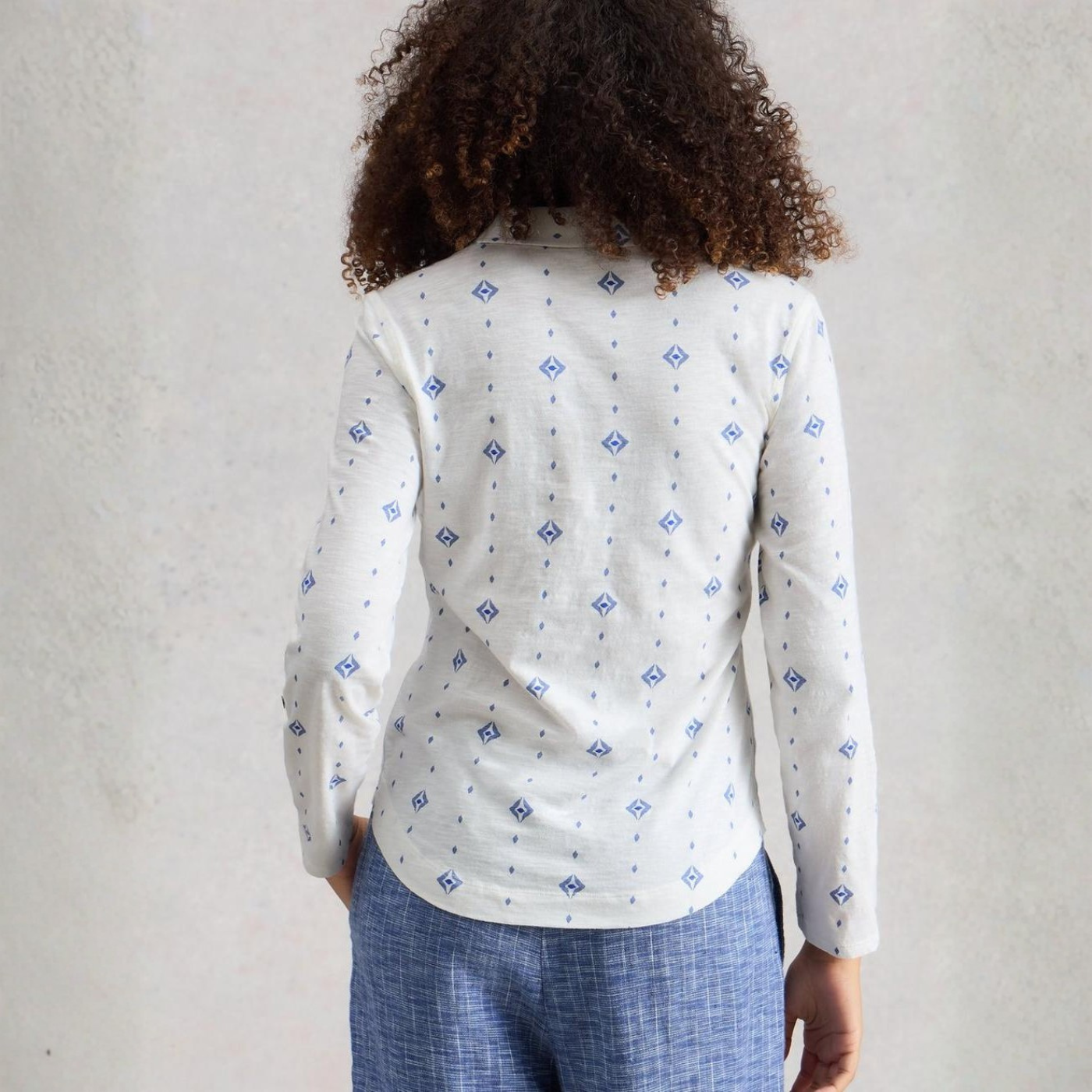 - Geoghegans Notes: The White Stuff Annie Jersey Shirt in White Print is an easy-wear staple made from soft, comfortable jersey fabric. Featuring a gentle blue print and a relaxed fit, it’s ideal for everyday styling. A dependable piece that pairs effortlessly with jeans or trousers, offering timeless appeal with a modern, comfortable feel.