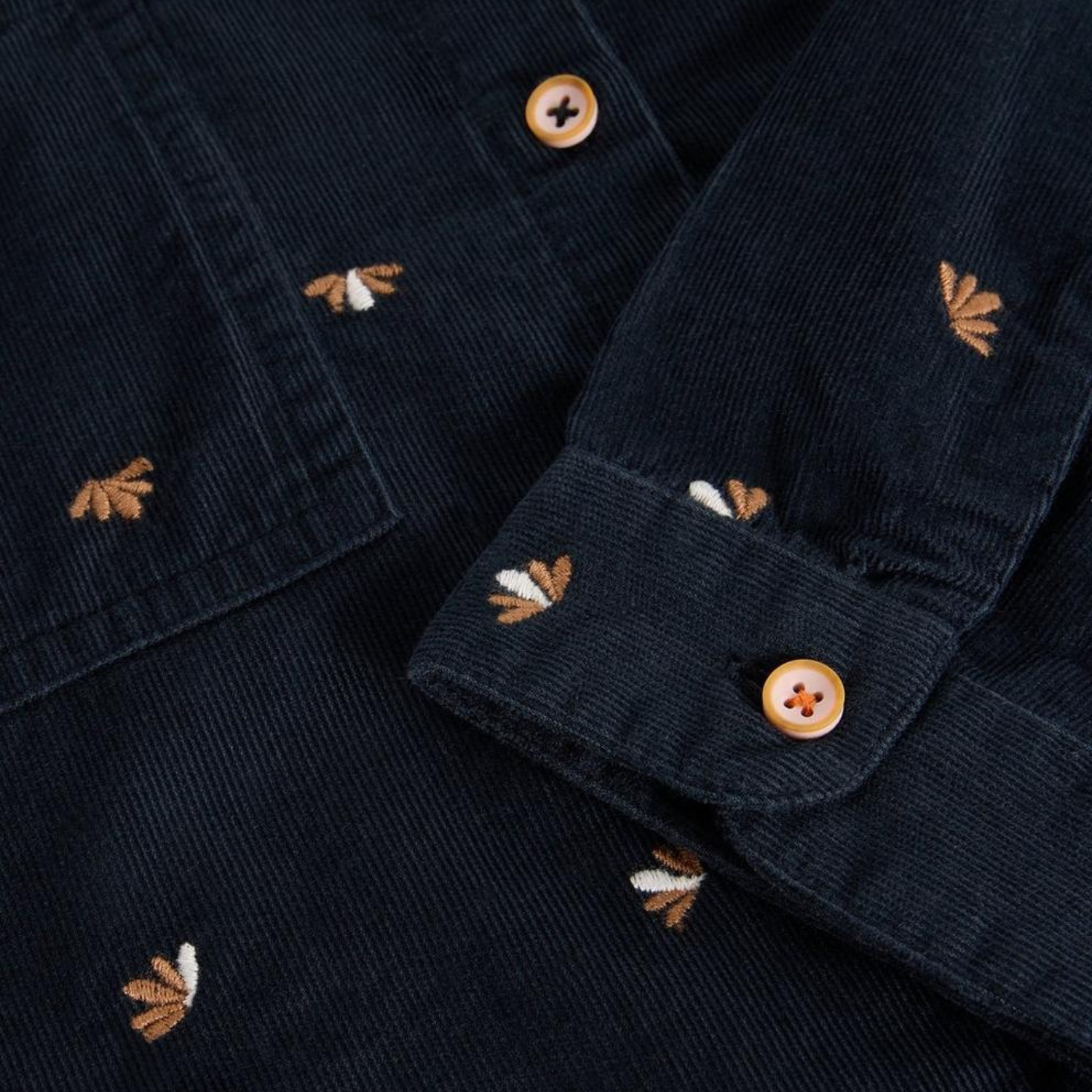 • Geoghegans Notes: A classic cord-style shirt in a navy base with multi-coloured embroidered detail. It’s crafted from 100% organic cotton, giving it substantial texture and a comfortable yet structured feel. It has a regular fit with long sleeves, a button-through front, classic collar and pocket details, a piece that works beautifully both as a standalone top or layered over simple tees and knitwear.