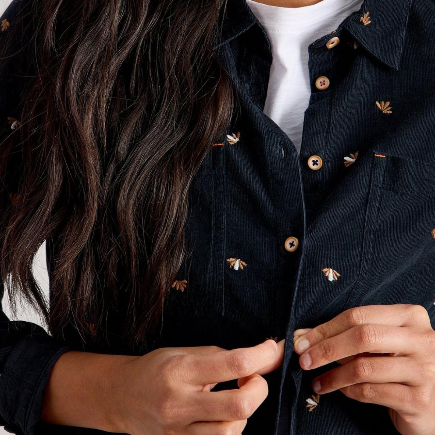 Close up view of Model buttoning the White Stuff Sophie Cord Shirt, in multi Grey.