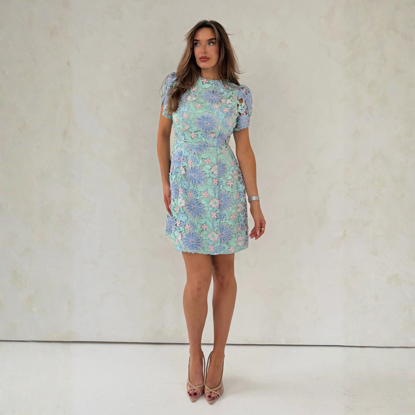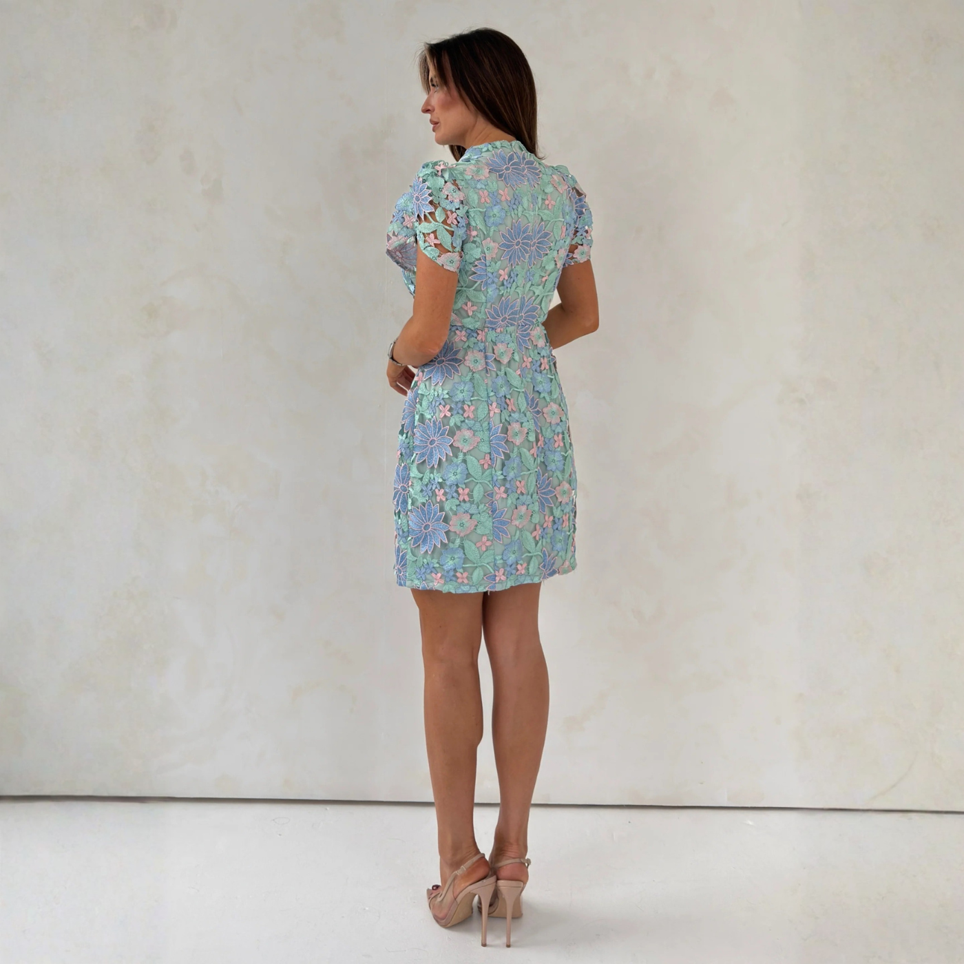 - Geoghegan's Notes: Step into timeless style with this beautifully crafted short-sleeve mini dress. Intricate crochet detailing highlights its fine workmanship, while the soft, breathable fabric ensures comfort throughout the day. The gently structured silhouette flatters the figure, complemented by subtle petal-inspired accents that bring a romantic finish. A versatile piece, perfect for special occasions or adding a touch of elegance to your everyday wardrobe.