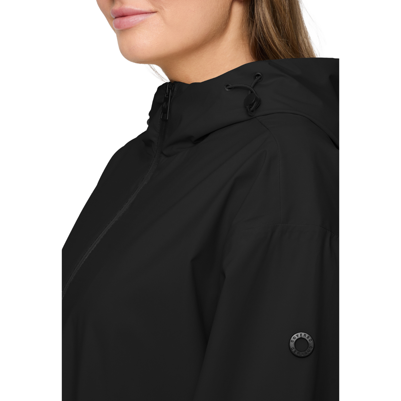 Black raincoat with a brand logo on a white background