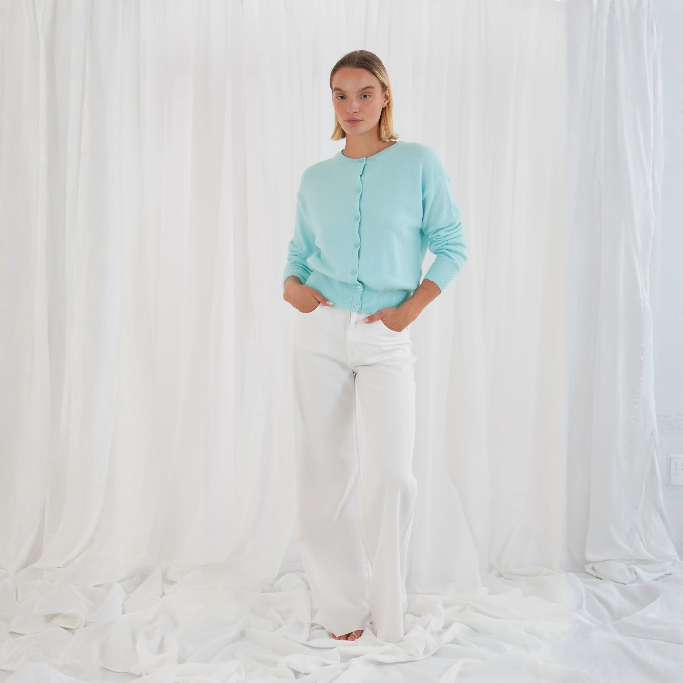 • Load image into Gallery viewer, Person wearing a light blue cardigan and white pants against a white background
