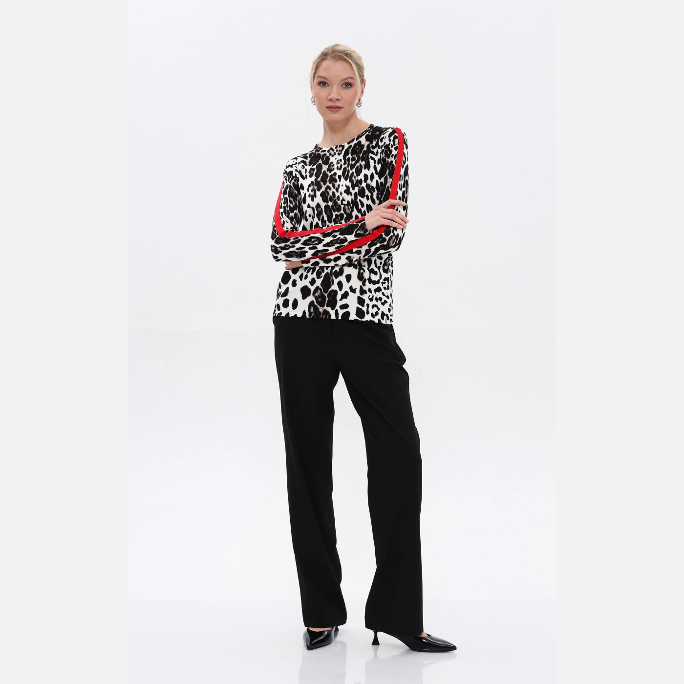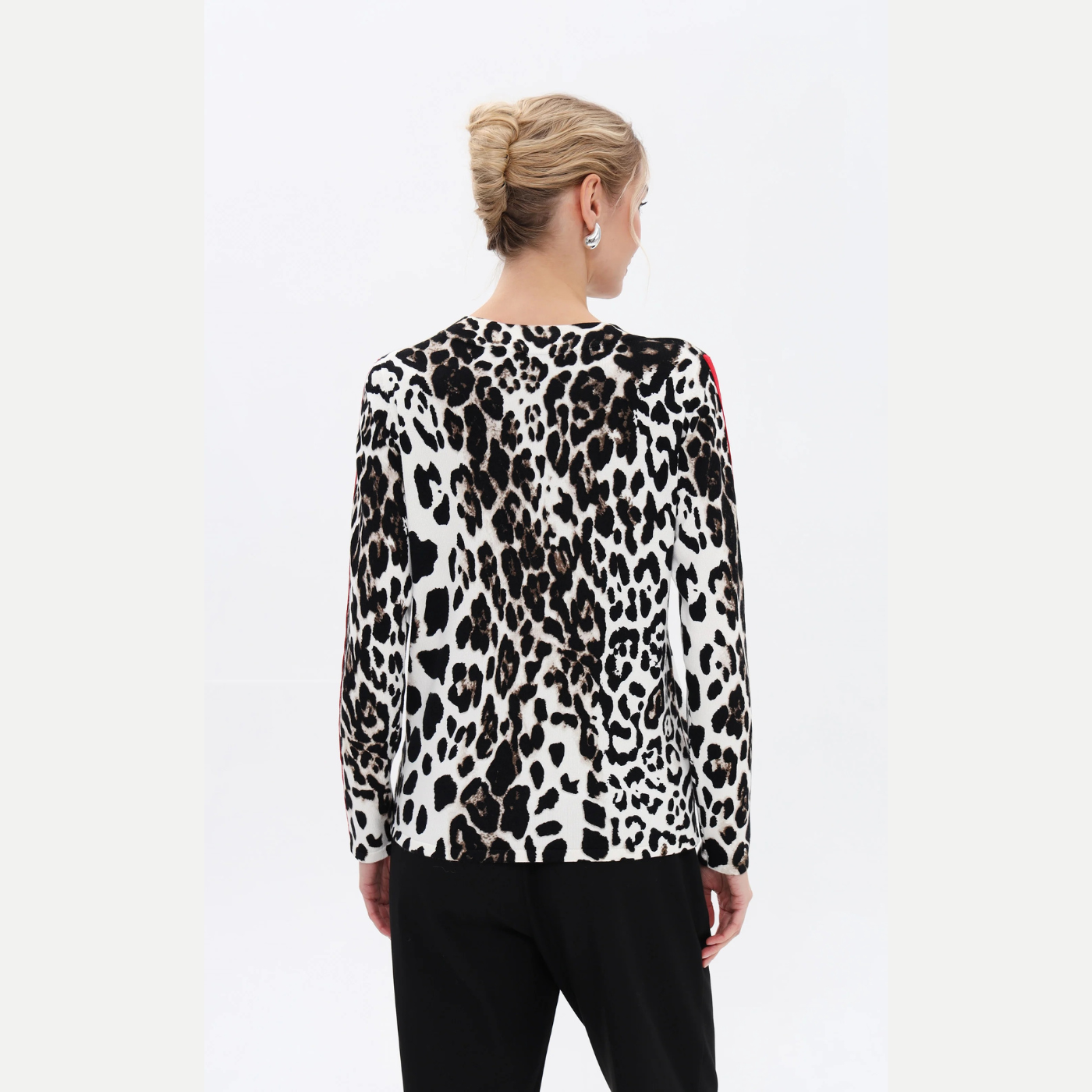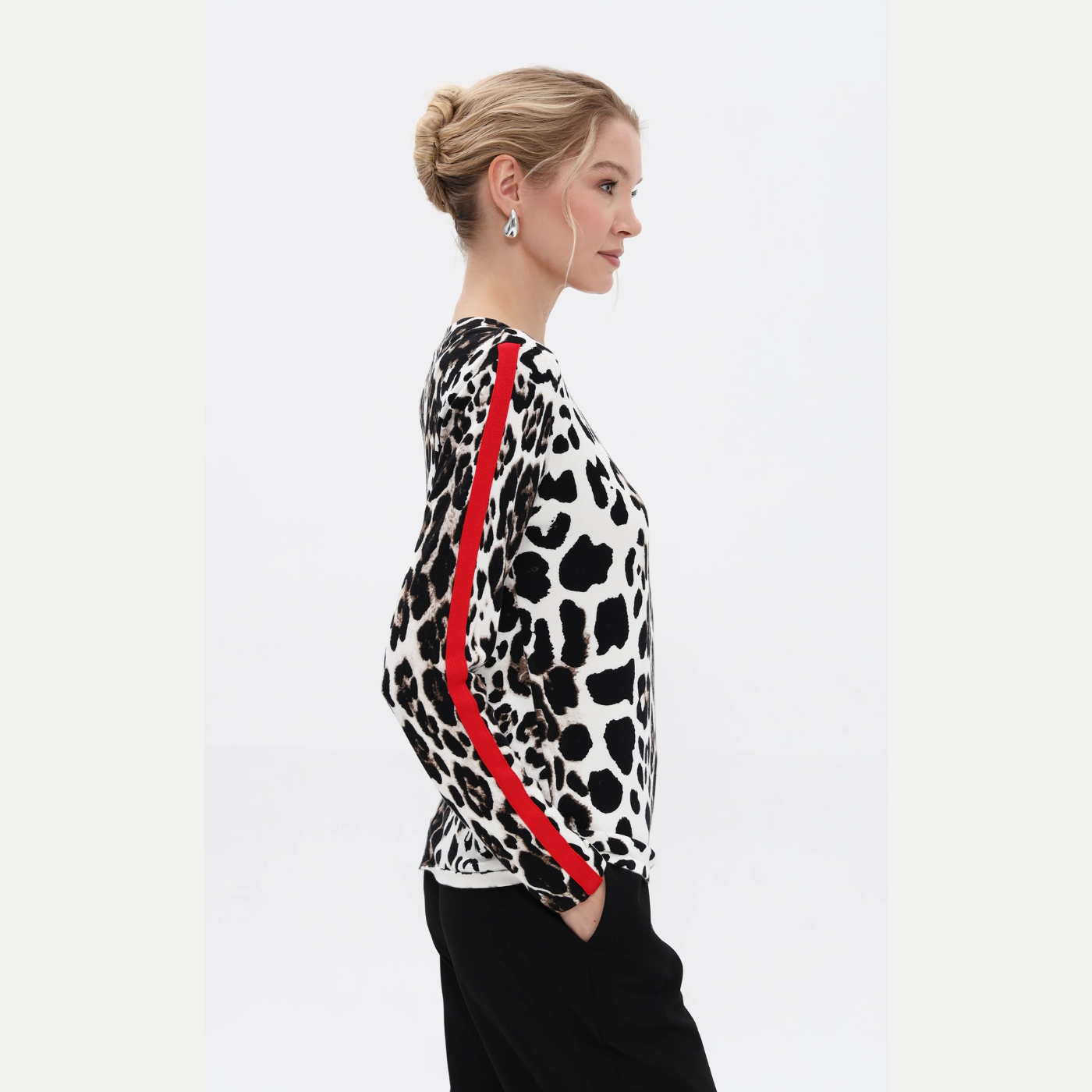 - Geoghegans Notes: The Passioni Sweater adds a playful edge to your wardrobe with its leopard print and bold red stripes. Made from soft, comfortable material and designed with a relaxed fit, it offers effortless style and versatility for any occasion.