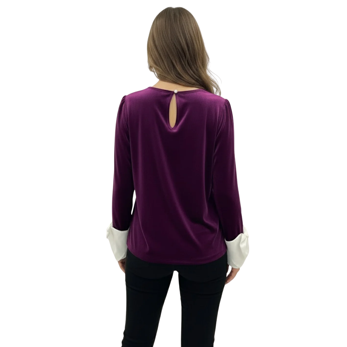 Image of  model in front facing pose wearing Kate & Pippa Velvet Top in Plum