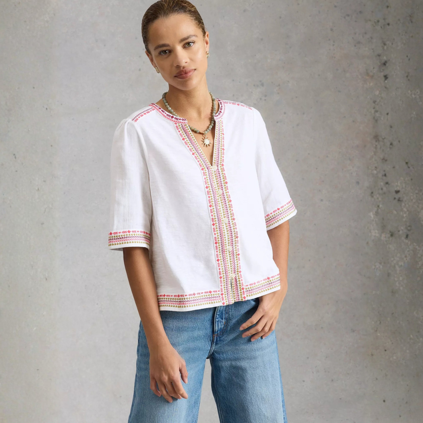 Woman wearing a white blouse with colorful embroidery on a plain background