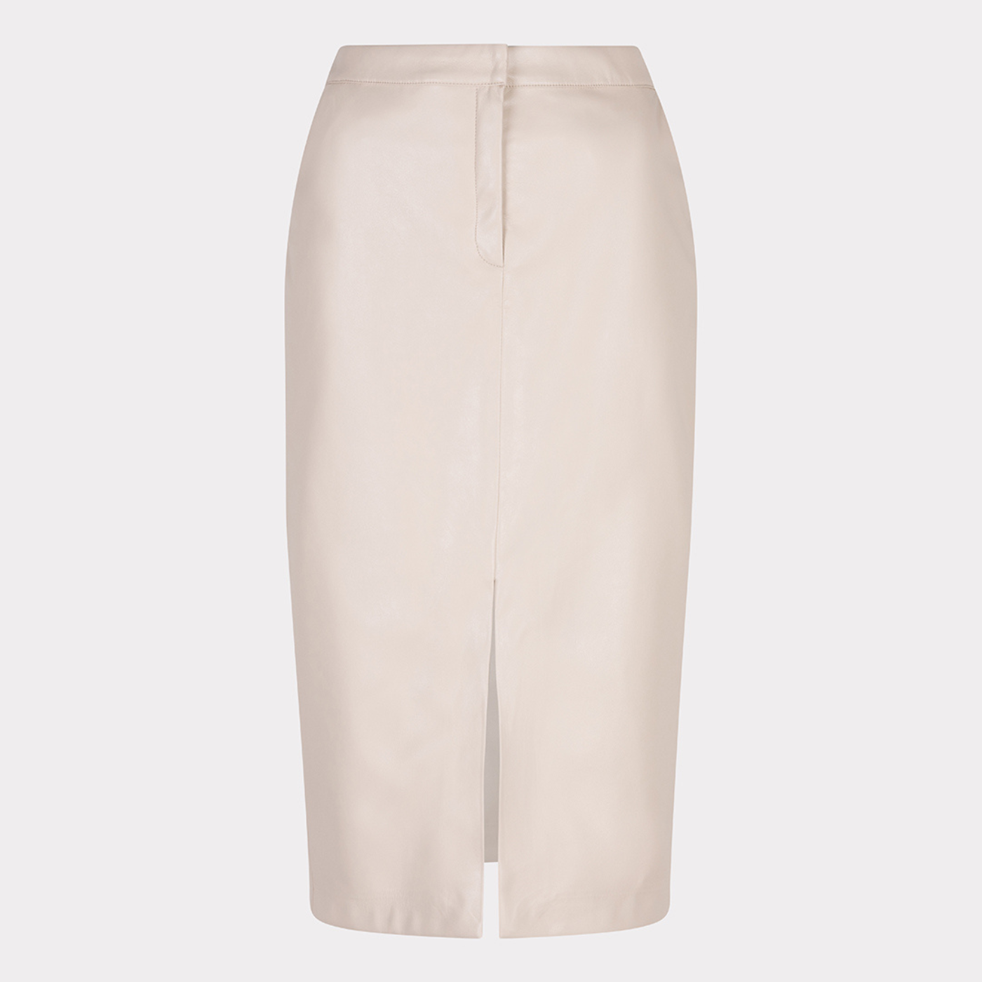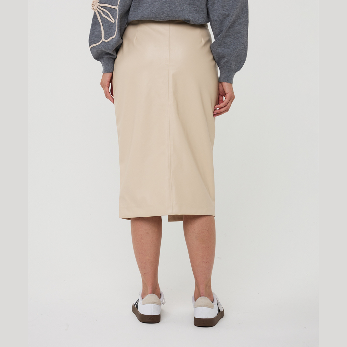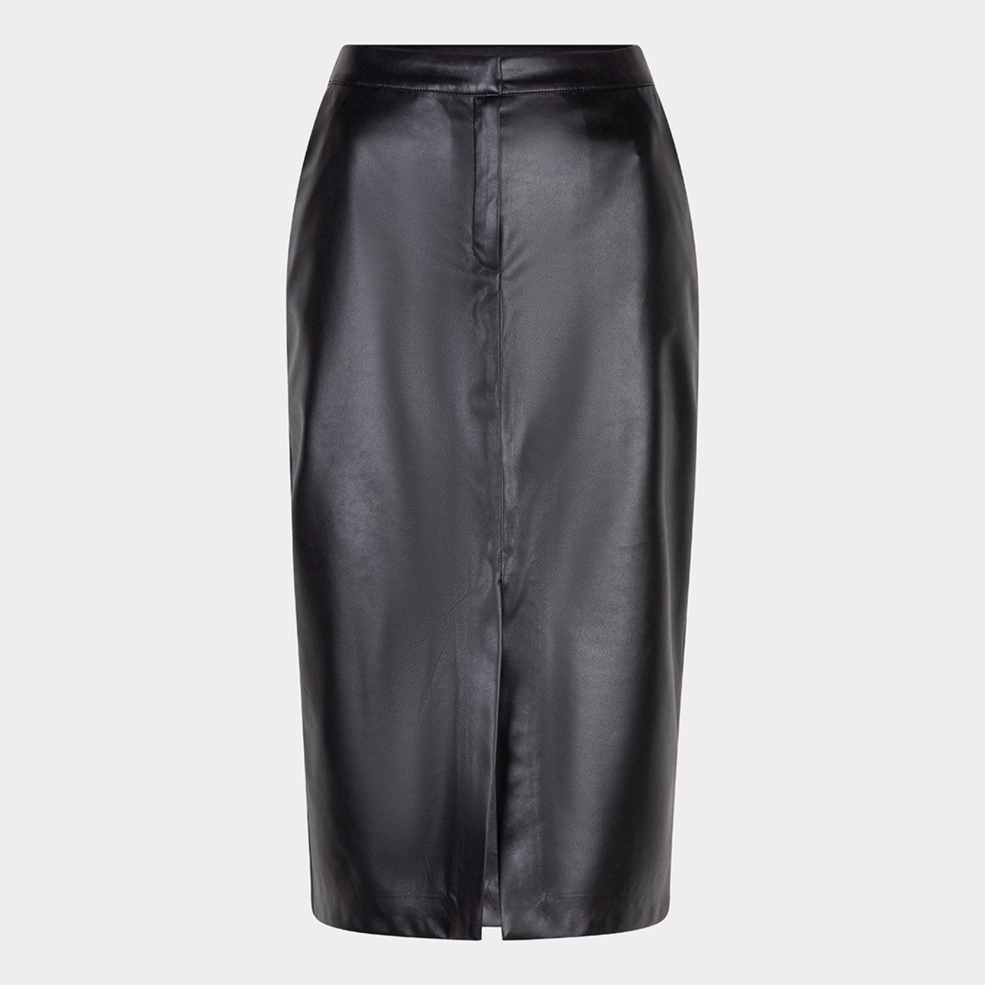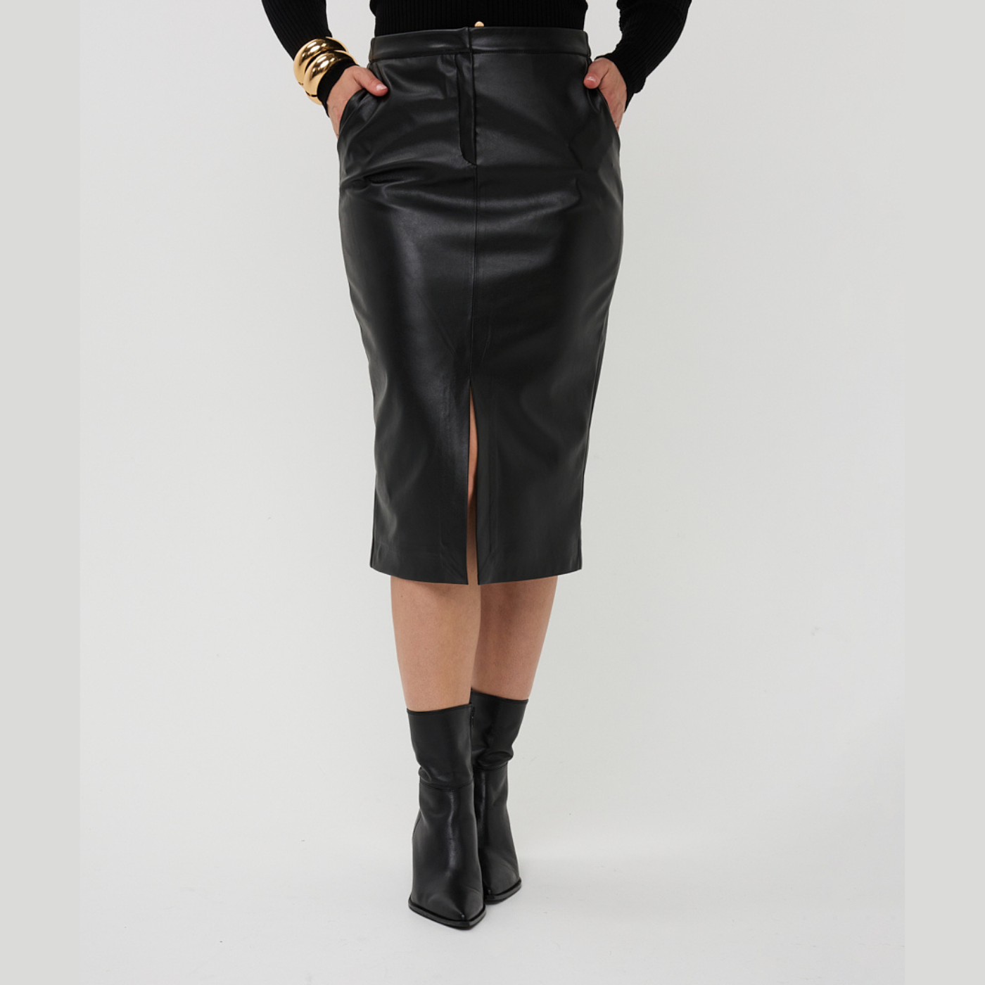- Geoghegan's Notes: Fall into the Season with this vegan leather skirt, featuring chic slit pockets and a front slit for added movement. Effortlessly versatile, it pairs perfectly with your favourite cozy knit.