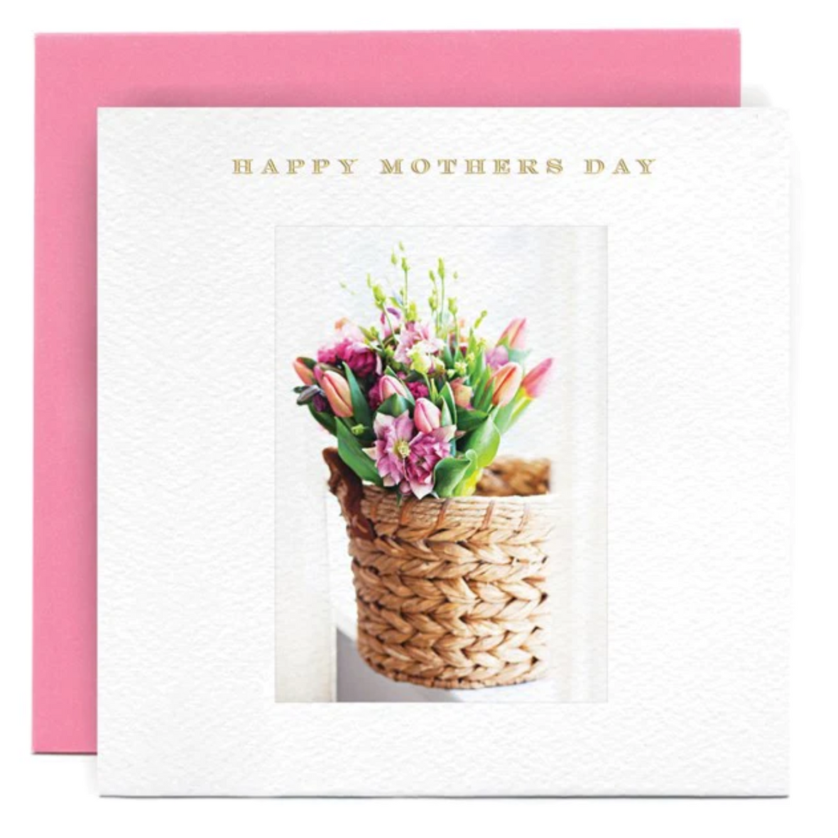 - Geoghegan's Notes: A beautifully simplistic Mother's Day card featuring a stunning bouquet of flowers in a woven basket and the words 'Happy Mother's Day' in gold over the top.
