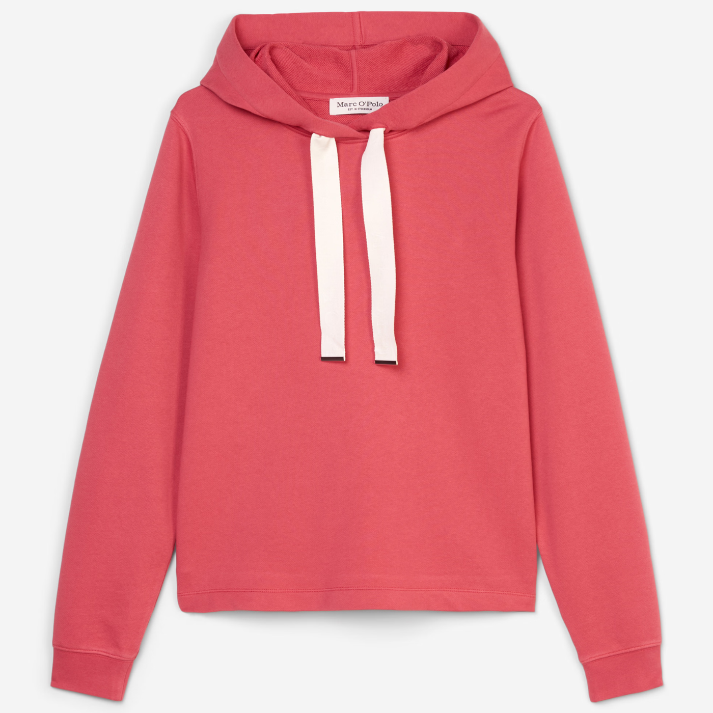 Geoghegans Notes: The Marc O' Polo Organic Cotton Hooded Sweatshirt in Berry brings a touch of 80s-inspired retro flair to your wardrobe. This casual must-have features a relaxed fit, double-layered hood, long sleeves, and ribbed cuffs and back hem for a cozy finish. The standout detail is the wide XL drawstring with embossed logo, adding a bold touch. Perfect for making a statement, pair it with matching sweat or jersey pants for the ultimate casual-chic look.