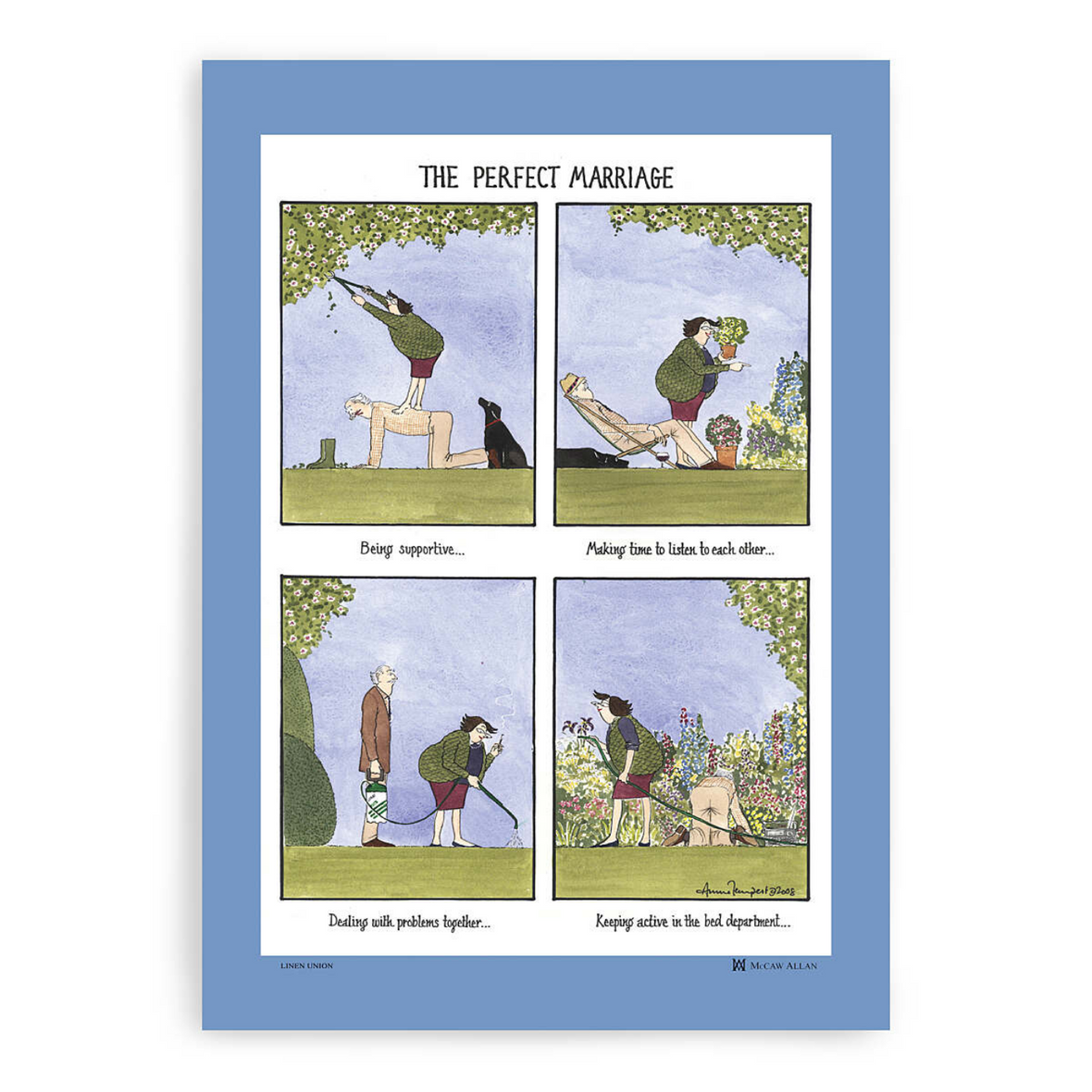 • Introducing the amusing "The Perfect Marriage" design from the playful Tottering by Gently Samuel Lamont range. This 100% Cotton Tea Towel is a delightful addition to your everyday kitchen essentials. With its humorous illustration, it brings a touch of laughter to your home. Complete with an easy hang loop, it can be proudly displayed or gifted to friends and family. It also makes for a perfect keepsake tea towel to commemorate wedding anniversaries.